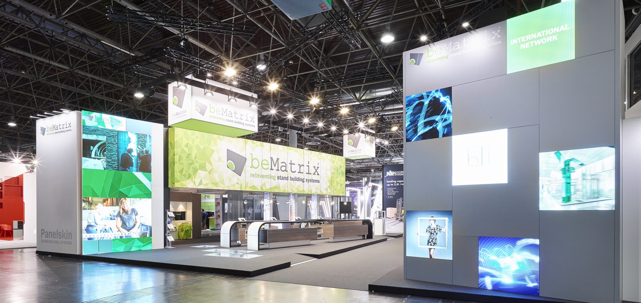 Modułowe stoiska targowe beMatrix System wystawienniczy beMatrix w unikalny sposób łączy w sobie funkcjonalność i design: Nowoczesny system składa się z aluminiowych ram, które zapewniają wysoką stabilność przy bardzo niskiej wadze. Wysokiej jakości, elegancki wygląd sprawia, że Państwa modułowe stoisko wystawiennicze będzie przyciągać wzrok na każdych targach.